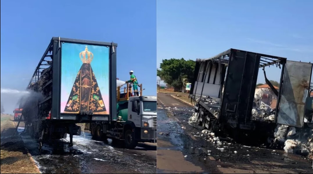 Uma carreta carregada com fardos de algodão pegou fogo, na manhã desta quinta-feira (28), na Rodovia Federal 267, em Bataguassu (MS). Apesar das chamas terem consumido a parte de carga do veículo, um painel de Nossa Senhora Aparecida, que estava acoplado na carroceria, ficou intacto.
